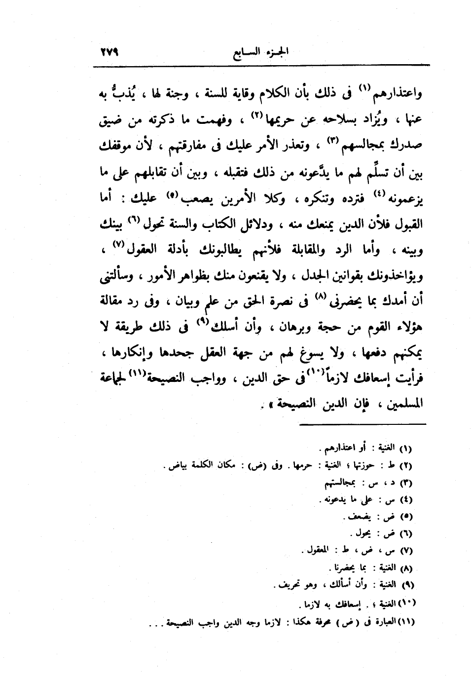 واعتذارهم في ذلك بأن الكلام وقاية للسنة، وجنة لها، يذب به عنها، ويزداد بسلاحه عن حريمها، وفهمت ما ذكرته من ضيق صدرك بمجالسهم، وتعذر الأمر عليك في مفارقتهم، لأن موقفك بين أن تسلم لهم ما يدعونه من ذلك فتقبله، وبين أن تقابلهم على ما يزعمونه فترده وتنكره، وكلا الأمرين يصعب عليك: أما القبول فلأن الدين يمنعك منه، ودلائل الكتاب والسنة تحول بينك وبينه، وأما الرد المقابلة فلأنهم يطالبونك بأدلة العقول، ويؤاخذونك بقوانين الجدل، ولا يقنعون منك بظواهر الأمور، وسألتني أن أمدك بما يحضرني في نصرة الحق من علم وبيان، وفي رد مقالة هؤلاء القوم من حجة وبرهان، وأن أسلك في ذلك طريقة لا يمكنهم دفعها، ولا يسوغ لهم من جهة العقل جحدها وإنكارها، فرأيت إسعافك لازماً في حق الدين، وواجب النصيحة لجماعة المسلمين، فإن الدين النصيحة) .