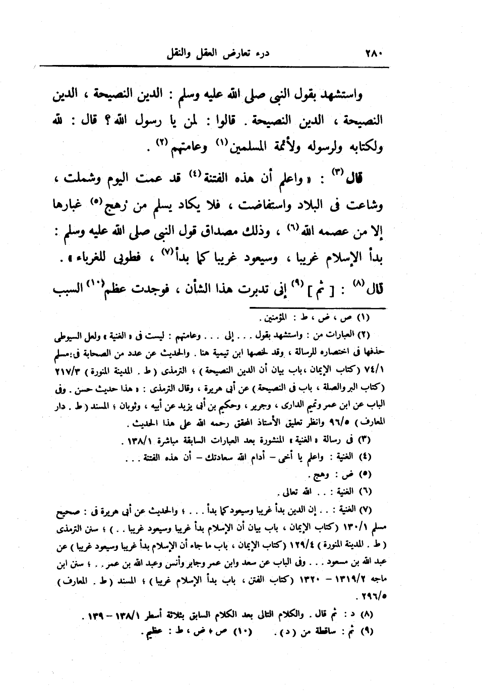 قال: (واعلم أن هذه الفتنة قد عمت اليوم وشملت، وشاعت في البلاد واستفاضت، فلا يكاد يسلم من رهج غبارها إلا من عصمه الله، وذلك مصداق قول النبي صلى الله عليه وسلم: «بدأ الإسلام غريباً، وسيعود غريباً كما بدأ، فطوبى للغرباء» .