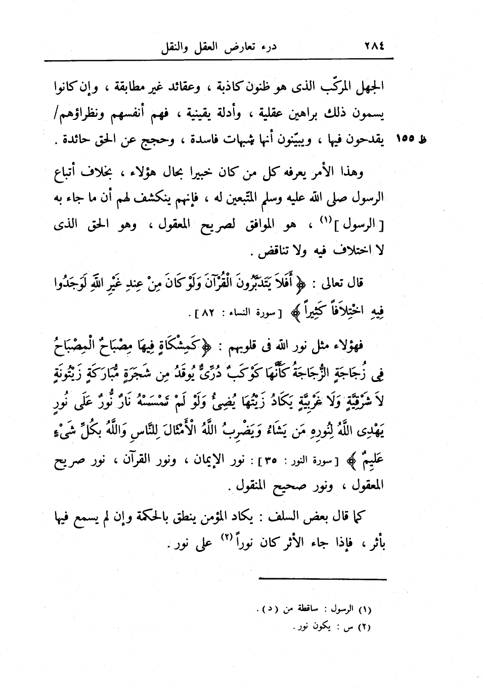 فهؤلاء مثل نور الله في قلوبهم: {كمشكاة فيها مصباح المصباح في زجاجة الزجاجة كأنها كوكب دري يوقد من شجرة مباركة زيتونة لا شرقية ولا غربية يكاد زيتها يضيء ولو لم تمسسه نار نور على نور يهدي الله لنوره من يشاء ويضرب الله الأمثال للناس والله بكل شيء عليم} : نور الإيمان، ونور القرآن، نور صريح المعقول، ونور صحيح المنقول.
