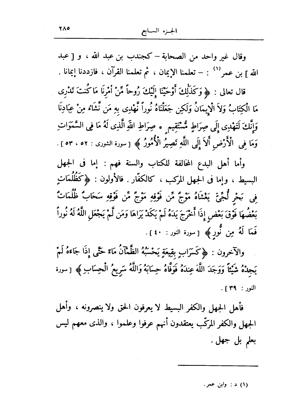 وأما أهل البدع المخالفة للكتاب والسنة فهم: إما في الجهل البسيط، وإما في الجهل المركب، كالكفار، فالأولون: {كظلمات في بحر لجي يغشاه موج من فوقه موج من فوقه سحاب ظلمات بعضها فوق بعض إذا أخرج يده لم يكد يراها ومن لم يجعل الله له نوراً فما له من نور} .