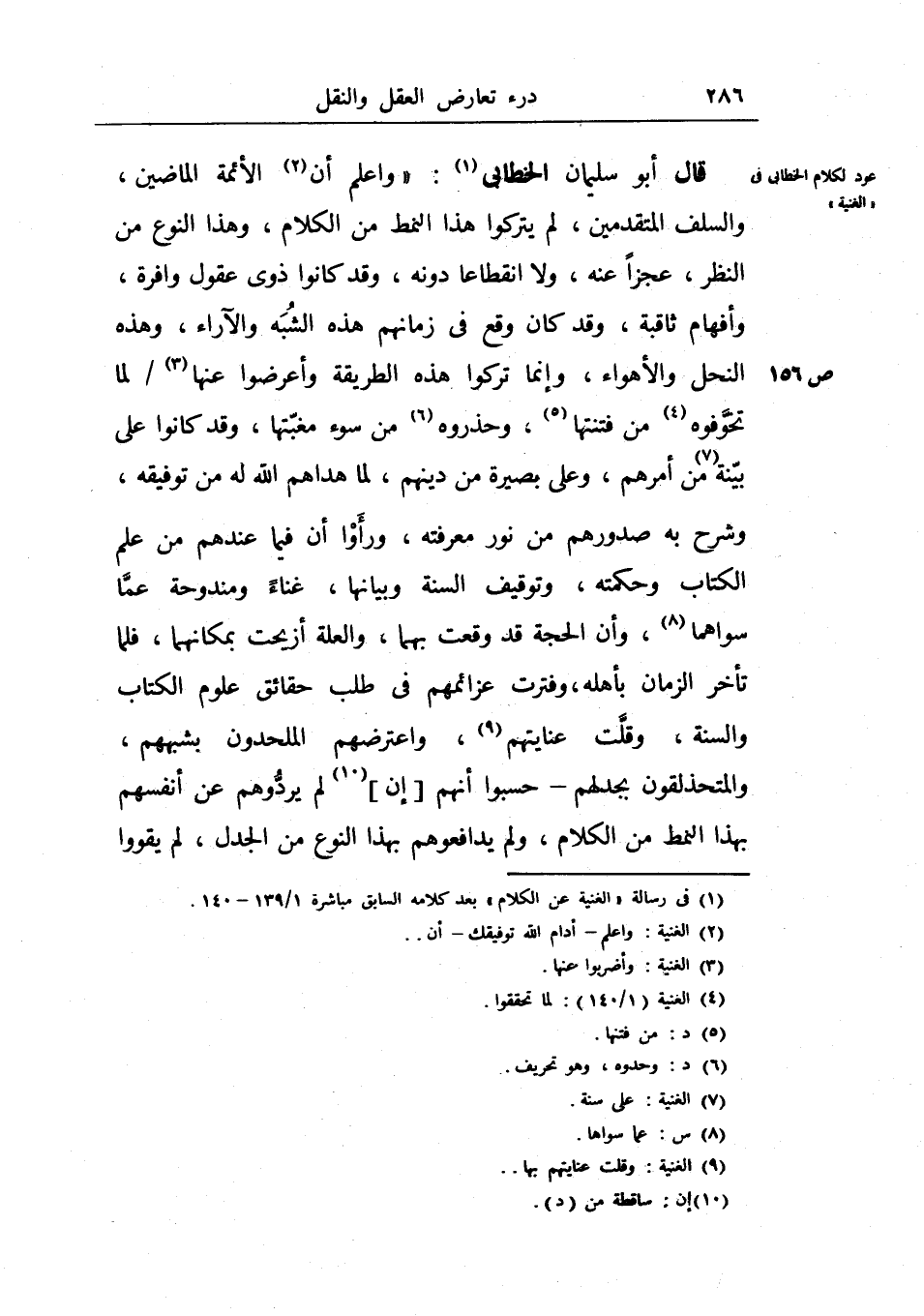 قال أبو سليمان الخطابي: (واعلم أن الأئمة الماضين، والسلف المتقدمين، لم يتركوا هذا النمط من الكلام، وهذا النوع من النظر، عجزاً عنه، ولا انقطاعاً دونه، وقد كانوا ذوي عقول وافرة، وأفهام ثاقبة، وقد كان وقع في زمانهم هذه الشبه والآراء، وهذه النحل والأهواء، وإنما تركوا هذه الطريقة وأعرضوا عنها لما تخوفوه من فتنتها، وحذروه من سوء مغبتها، وقد كانوا على بينة من أمرهم، وعلى بصيرة من دينهم، لما هاهم الله له من توفيقه، وشرح به صدورهم من نور معرفته، ورأوا أن فيما عندهم من علم الكتاب وحكمته، وتوقيف السنة وبيانها، غناء ومندوحة عما سواهما، وأن الحجة قد وقعت بهما، والعلة أزيحت بمكانهما، فلما تأخر الزمان بأهله، وفترت عزائمهم في طلب حقائق علوم الكتاب والسنة، وقلت عنايتهم، واعترضهم الملحدون بشبههم، والمتحذلقون بجدلهم - حسبوا أنهم إن لم يردوهم عن أنفسهم بهذا النمط من الكلام، ولم يدافعوهم بهذا النوع من الجدل، لم يقووا