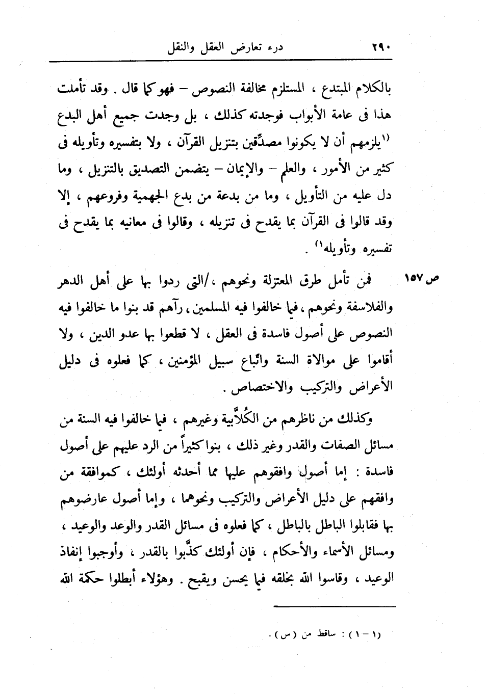 فمن تأمل طرق المعتزلة ونحوهم، التي ردوا بها على أهل الدهر والفلاسفة ونحوهم، فيما خالفوا فيه المسلمين، رآهم قد بنوا ما خالفوا فيه النصوص على أصول فاسدة في العقل، لا قطعوا بها عدوا الدين، ولا أقاموا على موالاة السنة واتباع سبيل المؤمنين، كما فعلوه في دليل الأعراض والتركيب والاختصاص.
