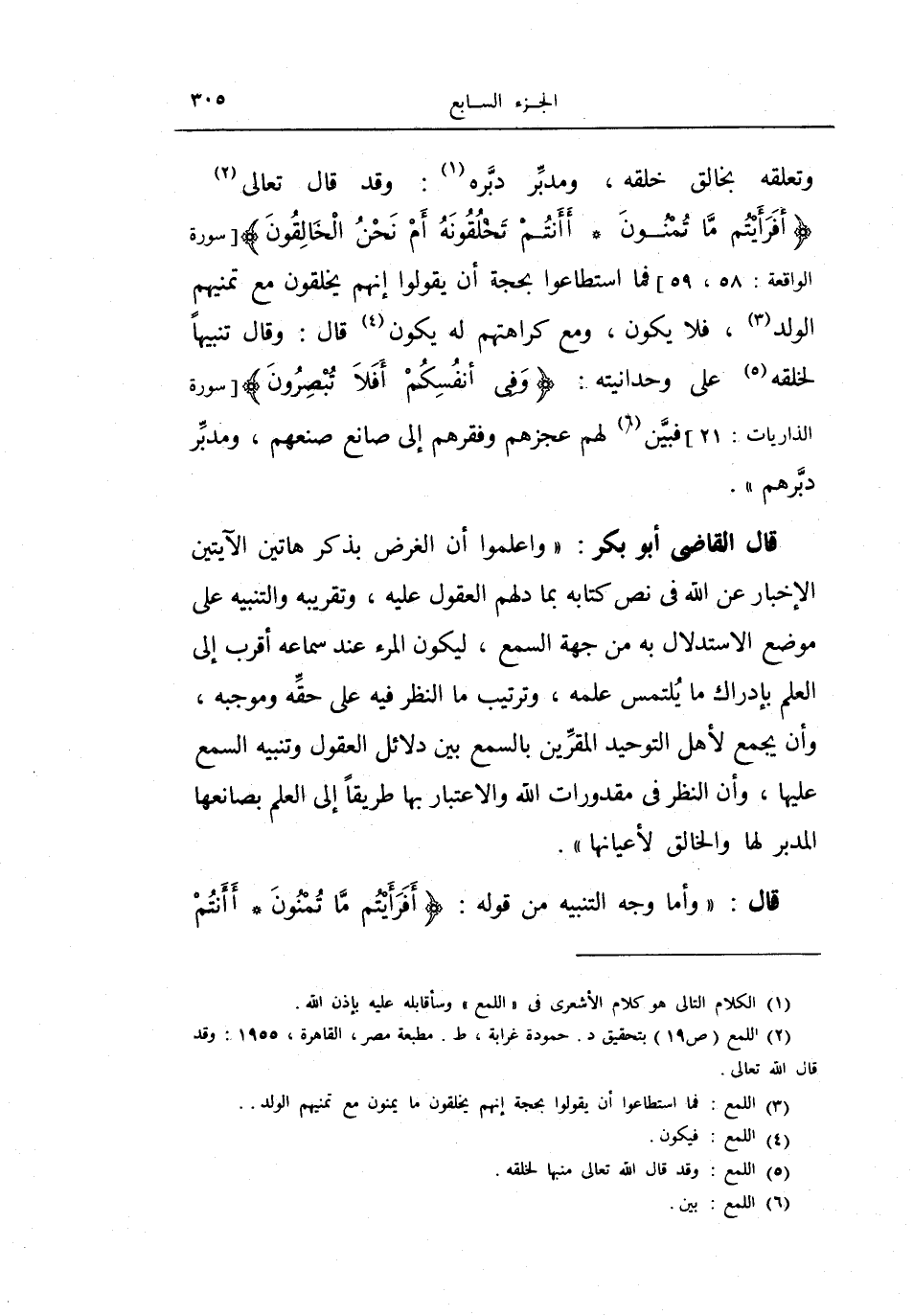 وتعلقه بخالق خلقه، ومدبر دبره: وقد قال تعالى: {أفرأيتم ما تمنون * أأنتم تخلقونه أم نحن الخالقون} فما استطاعوا بحجة أن يقولوا إنهم يخلقون مع تمنيهم الولد، فلا يكون، ومع كراهتهم له يكون قال: وقال تنبيهاً لخلقه على وحدانيته: {وفي أنفسكم أفلا تبصرون} ، فبين لهم عجزهم وفقرهم إلى صانع صنعهم، ومدبر دبرهم) .