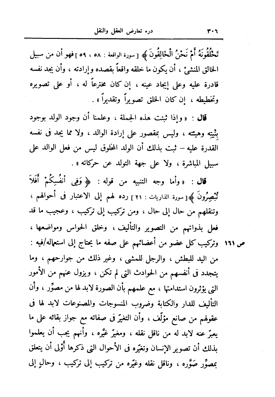 قال: (وأما وجه التنبيه من قوله: {وفي أنفسكم أفلا تبصرون} ، رده لهم إلى الاعتبار في أحوالهم، وتنقلهم من حال إلى حال، ومن تركيب إلى تركيب، وعجيب ما قد فعل بذواتهم من التصوير والتأليف، وخلق الحواس ومواضعها، وتركيب كل عضو من أعضائهم على صفة ما يحتاج إلى استعماله فيه: من اليد للبطش، والرجل للمشي، وغير ذلك من جوارحهم، ومايتجدد في أنفسهم من الحوادث التي لم تكن، ويزول عنهم من الأمور الني يؤثرون استدامتها، مع علمهم بأن الصورة لا بد لها من مصور، وأن التأليف للدار والكتابة وضروب المنسوجات والمصنوعات لا بد لها في عقولهم من صانع مؤلف، وأن التغير في صفاته مع جواز بقائه على ما يعبر عنه لا بد له من ناقل نقله، ومغير غيره، وأنهم يجب أن يعلموا بذلك أن تصوير الإنسان وتغيره في الأحوال التي ذكرها أولى أن يتعلق بمصور صوره، وناقل نقله وغيره من تركيب إلى تركيب، وحال إلى