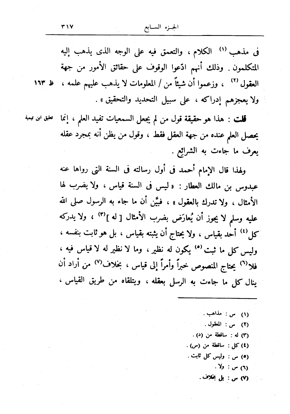ولهذا قول الإمام أحمد في أول رسالته في السنة التي رواها عنه عبدوس بن مالك العطار: (ليس في السنة قياس، ولا يضرب لها الأمثال، ولا تدرك بالعقول) ، فبين أن ما جاء به الرسول صلى الله عليه وسلم لا يجوز أن يعارض بضرب الأمثال له، ولا يدركه كل أحد بقياس، ولا يحتاج أن يثبته بقياس، بل هو ثابت بنفسه، وليس كل ما ثبت يكون له نظير، وما لا نظير له لا قياس فيه، فلا يحتاج المنصوص خبراً وأمراً إلى قياس، بخلاف من أردا أن ينال كل ما جاءت به الرسل بعقله، ويتلقاه من طريق القياس،
