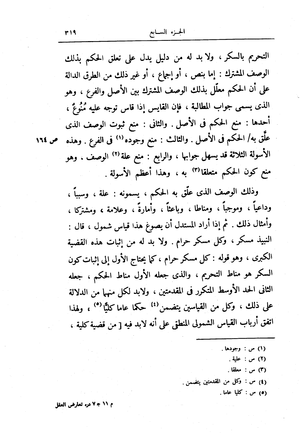 التحريم بالسكر، ولا بد له من دليل بدل على تعلق الحكم بذلك الوصف المشترك: إما بنص، أو إجماع، أوغير ذلك من الطرق الدالة على أن الحكم معلل بذلك الوصف المشترك بين الأصل والفرع، وهو الذي يسمى جواب المطالبة، فإن القايس إذا قاس توحه عليه منوع، أحدها: منع الحكم في الأصل.