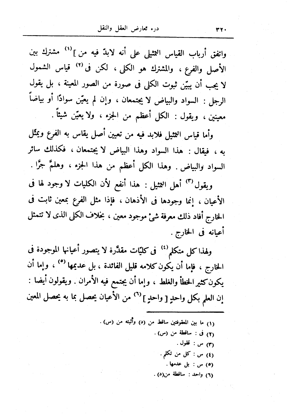 واتفق أرباب القياس التمثيلي على أنه لا بد فيه من مشترك بين الأصل والفرع، والمشترك هو الكلي، لكن في قياس الشمول لا يجب أن يبين ثبوت الكلي في صورة من الصور المعنية، بل يقول الرجل: السواد والبياص لا يجتمعان، وإن لم يعين سواداً أو بياضاً معينين، ويقول: الكل أعظم من الجزء، ولا يعين شيئاً.