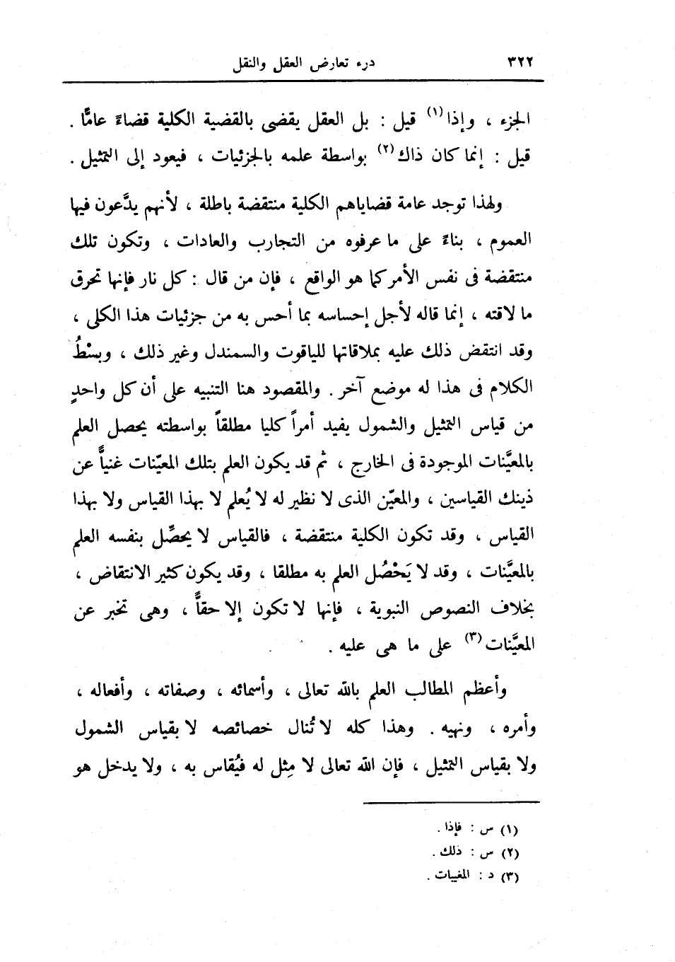 والمقصود هنا التنبيه على أن كل واحد من قياس التمثيل والشمول يفيد أمراً كلياً مطلقاً بواسطته يحصل العلم بالمعينات الموجودة في الخارج، ثم قد يكون العلم بتلك المعينات غنياً عن ذينك القياسين، والمعين الذي لا نظير به لا يعلم لا بهذا القياس ولا بهذا القياس، وقد تكون الكلية منتقضة، فالقياس لا يحصل بنفسه العلم بالمعينات، وقد لا يحصل العلم به مطلقاً، وقد يكون كثير الانتقاض، بخلاف النصوص النبوية، فإنها لا تكون إلا حقاً، وهي تخبر عن المعينات على ما هي عليه.