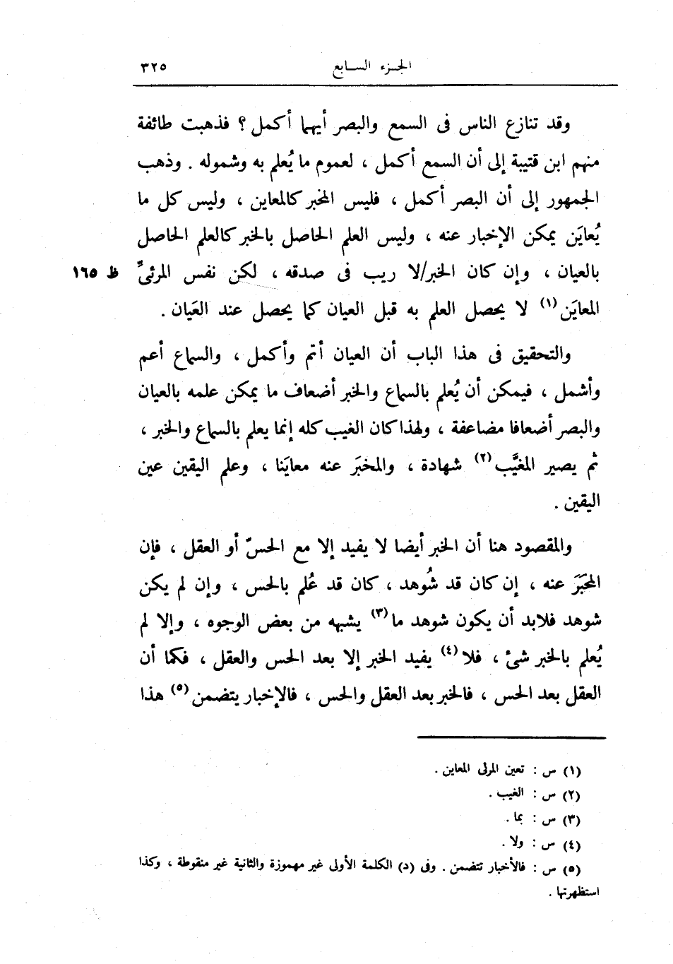 وذهب الجمهور إلى أن البصر أكمل، فليس المخبر كالمعاين، وليس كل ما يعاين يمكن الإخبار عنه، وليس العلم الحاصل بالخبر كالعلم الحاصل بالعيان، وإن كان الخبر لا ريب في صدقه، لكن نفس المرئي المعاين لا يحصل العلم به قبل العيان كما يحصل عن العيان.