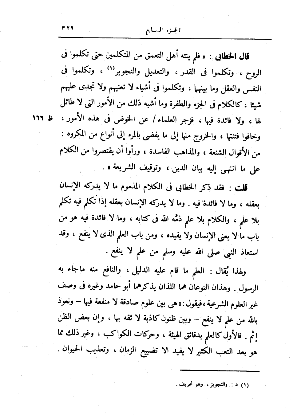 قال الخطابي: (فلم ينته أهل التعمق من المتكلمين حتى تكلموا في الروح وتكلموا في القدر، والتعديل والتجويز، وتكلموا في النفس والعقل وما بينهما، وتكلموا في أشياء لا تعنيهم ولا تجدي عليهم.
