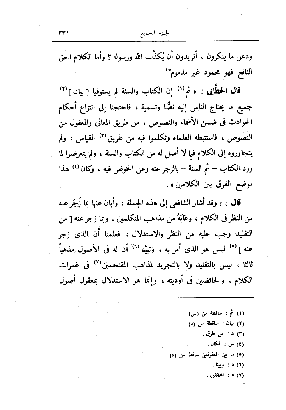 قال الخطابي: (ثم إن الكتاب والسنة لم يستوفيا بيان جميع ما يحتاج الناس إليه نصاً وتسمية، فاحتجنا إلى انتزاع أحكام الحوادث في ضمن الأسماء والنصوص، من طريق المعاني والمعقول من النصوص، فاستنبطه العلماء وتكلموا فيه من طريق القياس، ولم يتجاوزوه إلى الكلام فيما لا أصل له من الكتاب والسنة، ولم يتعرضوا لما ورد الكتاب - ثم السنة - بالزجر عنه وعن الخوض فيه، وكان هذا موضع الفرق بين الكلامين) .