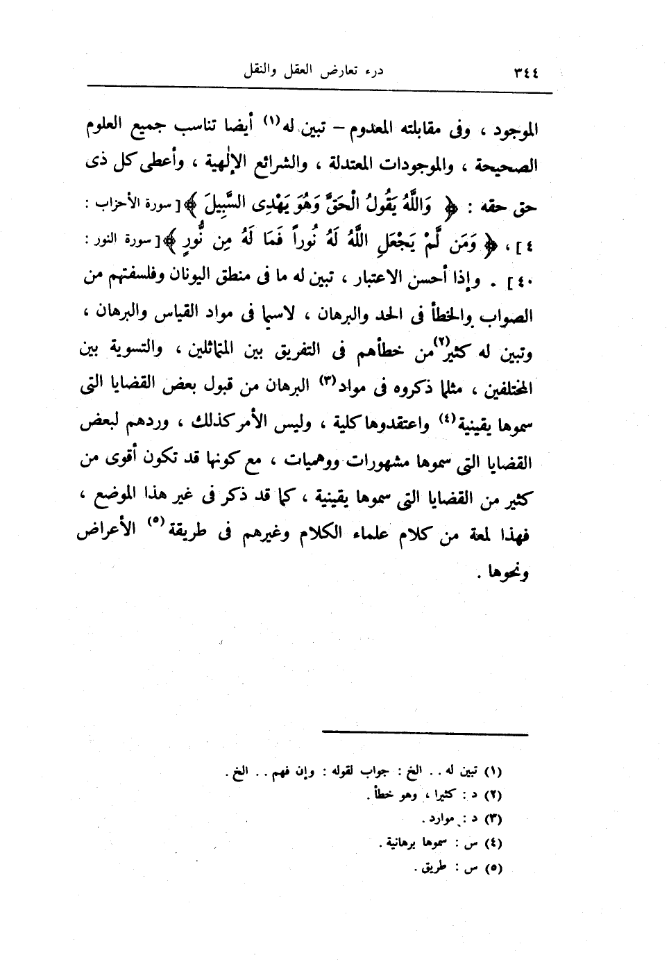 الموجود، وفي مقابلته المعدوم - تبين به أيضاً تناسب جميع العلوم الصحيحة، والموجودات المعتدلة، والشرائع الإلهية، وأعطى كل ذي حق حقه: {والله يقول الحق وهو يهدي السبيل} ، {ومن لم يجعل الله له نورا فما له من نور} .