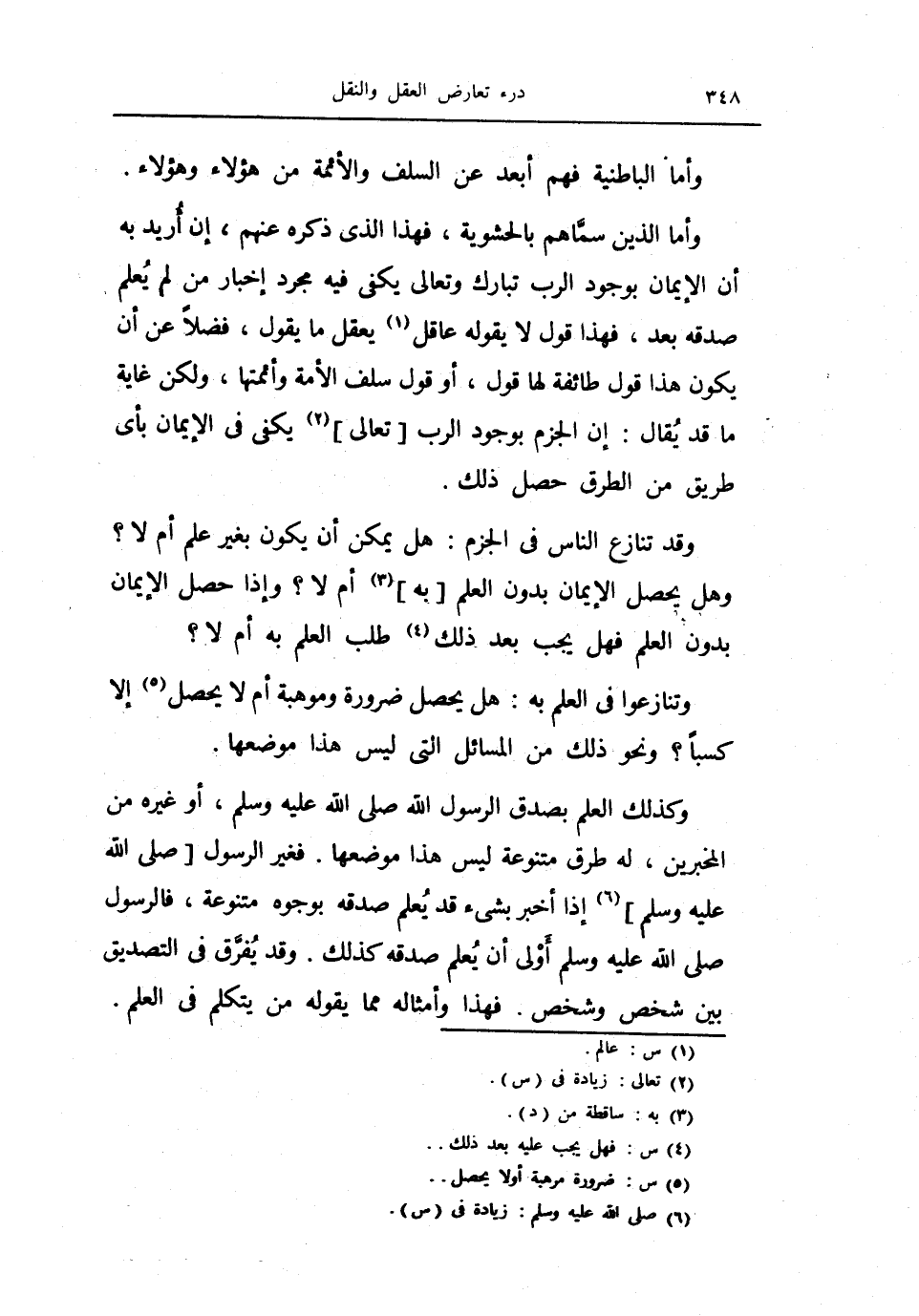 وأما الذي سماهم بالحشوية، فهذا الذي ذكره عنهم، إن يريد به أن الإيمان بوجود الرب تبارك وتعالى يكفي فيه مجرد إخبار من لم يعلم صدقه بعد، فهذا قول لا يقوله عاقل يعقل ما يقول، فضلاً عن أن يكون هذا قول طائفة لها قول، أو قول سلف الأمة وأئمتها، ولكن غاية ما قد يقال: إن الجزم بوجود الرب تعالى يكفي في الأيمان بأي طريق من الطرق حصل ذلك.