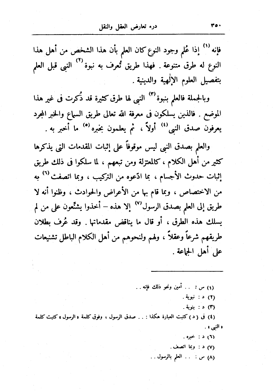 ولعلم بصدق النبي ليس موقوفاً على إثبات المقدمات التي يذكرها كثير من أهل الكلام، كالمعتزلة ومن تبعهم، لما سلكوا في ذلك طريق إثبات حدوث الأجسام، بما ادعوه من التركيب، وبما اتصفت به من الاختصاص، وبما قام بها من الأعراض والحوادث، وظنوا أنه لا طريق إلى العلم بصدق الرسول إلا هذه - أخذوا يشنعون على من لم يسلك هذه الطرق، أو قال ما يناقض مقدماتها.