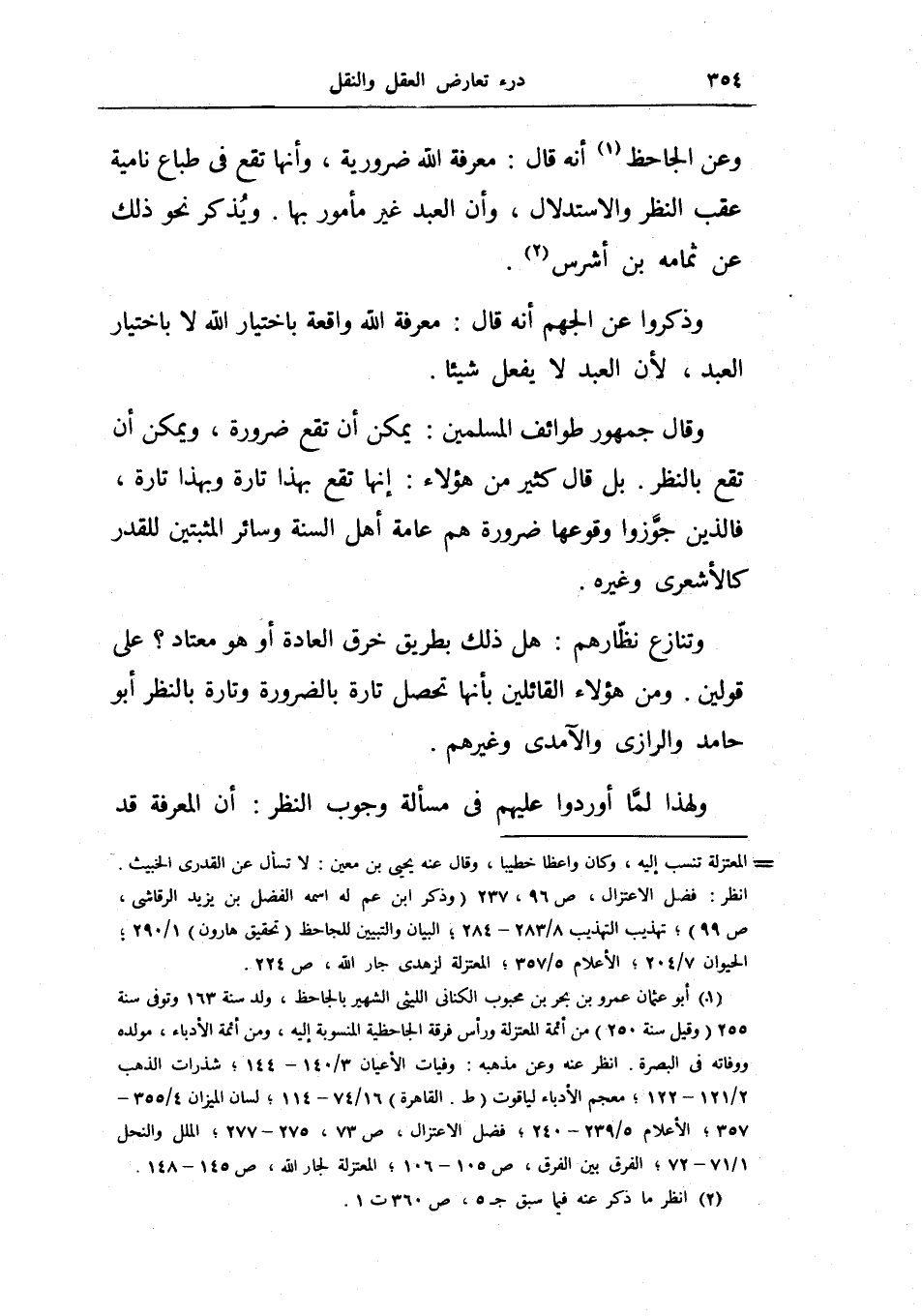 وعن الجاحظ أنه قال: معرفة الله ضرورية، وأنها تقع في طباع نامية عقب النظر والاستدلال، وأن العبد غير مأمون بها.