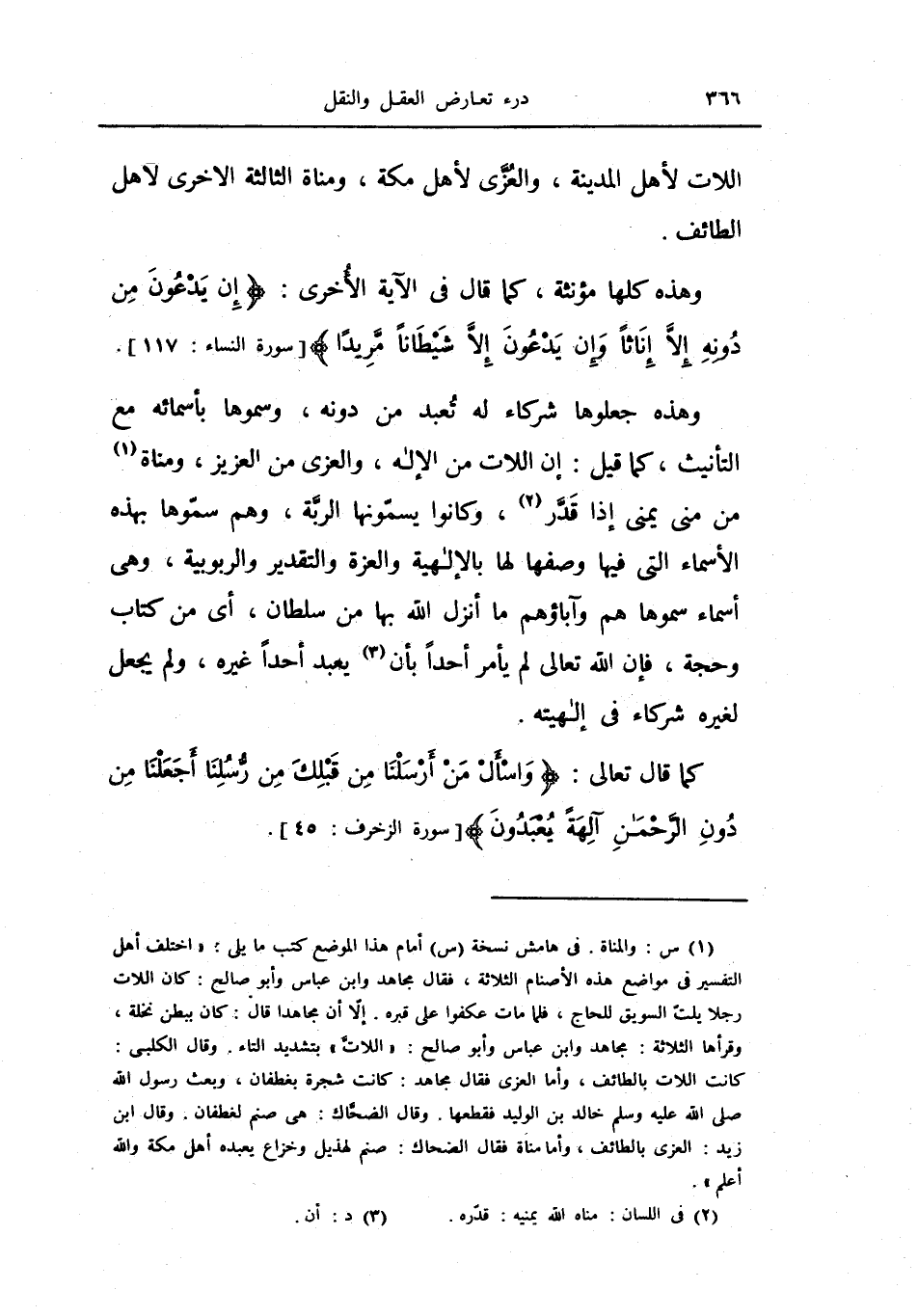 اللات لأهل المدينة، والعزى لأهل مكة، ومناة الثالثة الأخرى لأهل الطائف.