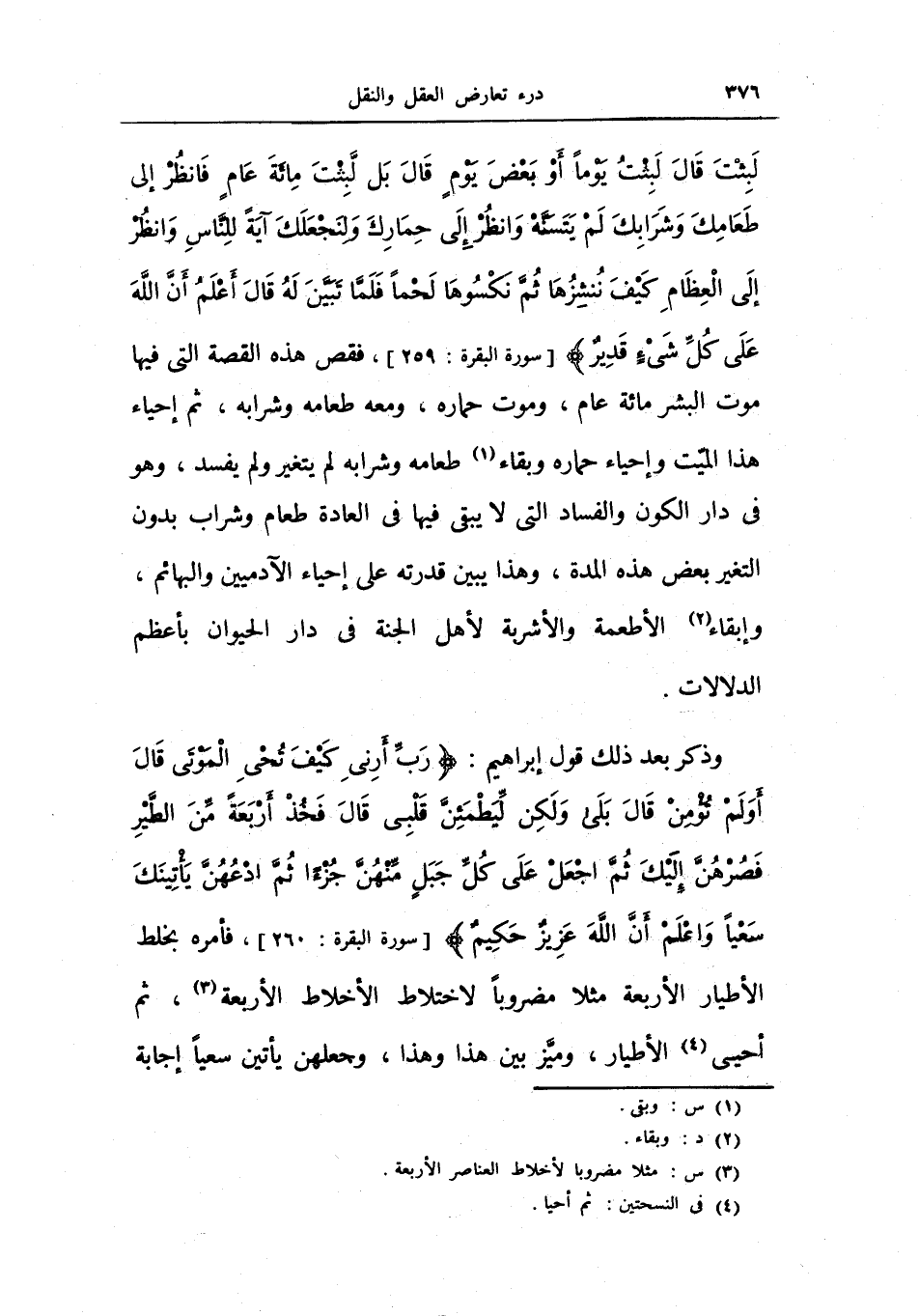 لبثت قال لبثت يوما أو بعض يوم قال بل لبثت مائة عام فانظر إلى طعامك وشرابك لم يتسنه وانظر إلى حمارك ولنجعلك آية للناس وانظر إلى العظام كيف ننشزها ثم نكسوها لحما فلما تبين له قال أعلم أن الله على كل شيء قدير} ، فقص هذه القصة التي فيها موت البشر مائة عام، وموت حماره، ومعه طعامه وشرابه، ثم إحياء هذا الميت وإحياء حماره وبقاء طعامه وشرابه لم يتغير ولم يفسد، وهو في دار الكون والفساد التي لا يبقى فيها في العادة طعام وشراب بدون التغير بعض هذه المدة، وهذا يبين قدرته على إحياء الآدميين والبهائم، وإبقاء الأطعمة والأشربة لأهل الجنة في دار الحيوان بأعظم الدلالات.