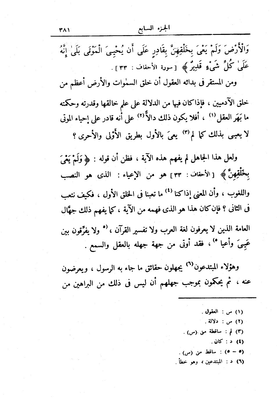 ولعل هذا الجاهل لم يفهم هذه الآية، فظن أن قوله: {ولم يعي بخلقهن} ، وهو من الإعياء: الذي هو النصب اللغوب، وأن المعنى إذا كنا ما تعبنا في الخلق الأول، فكيف نتعب في الثاني؟ فإن كان هذا هو الذي فهمه من الآية، كما يفهم ذلك جهال العامة الذين لا يعرفون لغة العرب ولا تفسير القرآن، ولا يفرقون بين عيي وأعياء، فقد أوتي من جهة جهله بالعقل والسمع.