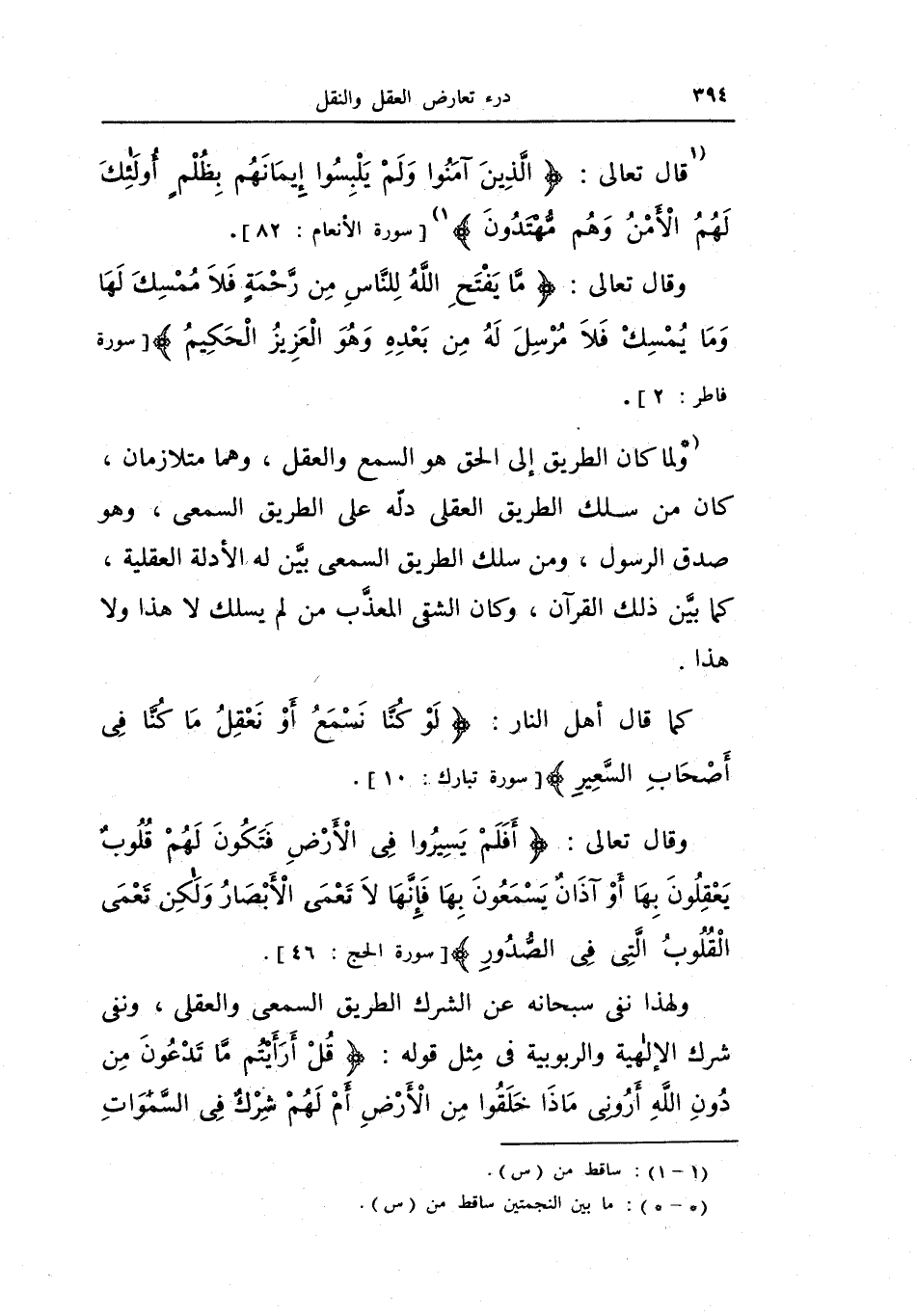 ولما كان الطريق إلى الحق هو السمع والعقل، وهما متلازمان، كان من سلك الطريق العقلي دله على الطرق السمعي، وهو صدق الرسول، ومن سلك الطريق السمعي بين له الأدلة العقلية، كما بين ذلك القرآن، وكان الشقي المعذب من لم يسلك لا هذا ولا هذا.