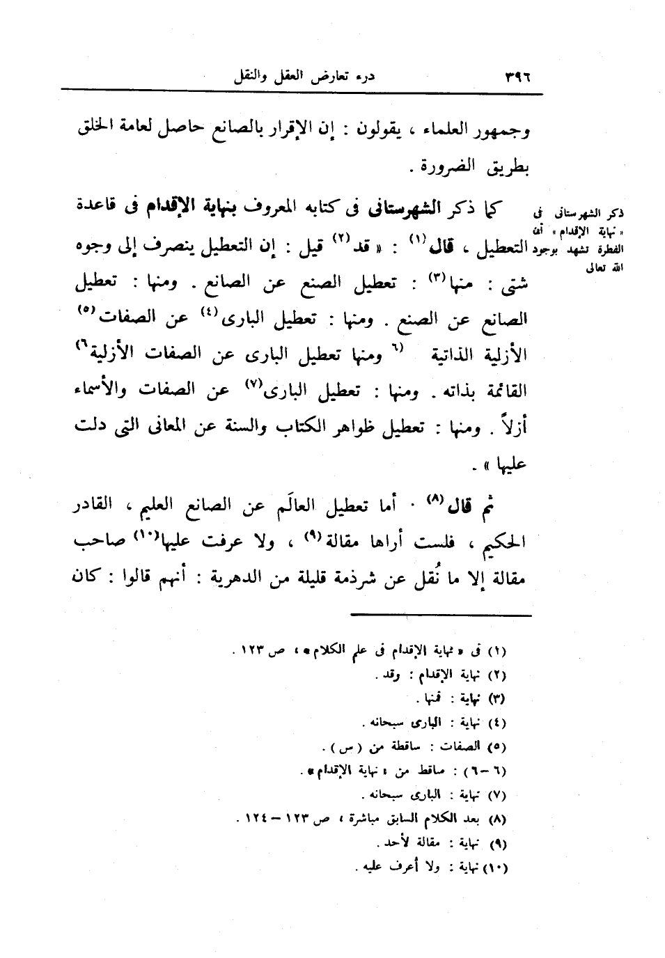 كما ذكر الشهرستاني في كتابه المعروف بنهاية الإقدام في قاعدة التعطيل قال: (قد قيل: إن التعطيل ينصرف إلى وجوه شتى: منها: تعطيل الصنع عن الصانع.