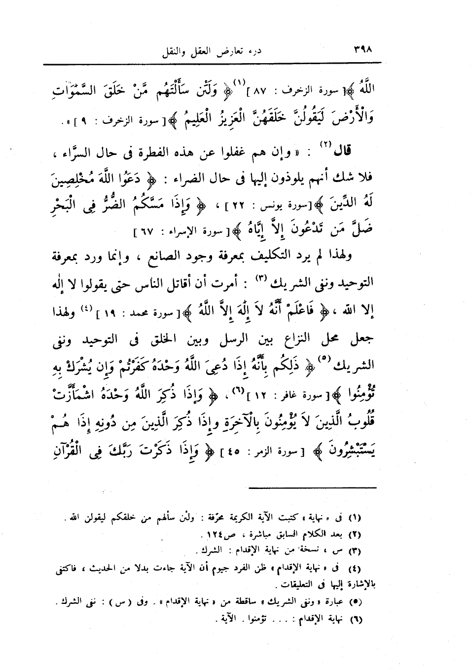 ولهذا لم يرد التكليف بمعرفة وجود الصانع، وإنما ورد بمعرفة التوحيد ونفي الشريك: أمرت أن أقاتل الناس حتى يقولوا لا إله إلا الله، {فاعلم أنه لا إله إلا الله} ، ولهذا جعل محل النزاع بين الرسل وبين الخلق في التوحيد ونفي الشريك {ذلكم بأنه إذا دعي الله وحده كفرتم وإن يشرك به تؤمنوا} ، {وإذا ذكر الله وحده اشمأزت قلوب الذين لا يؤمنون بالآخرة وإذا ذكر الذين من دونه إذا هم يستبشرون} {وإذا ذكرت ربك في القرآن