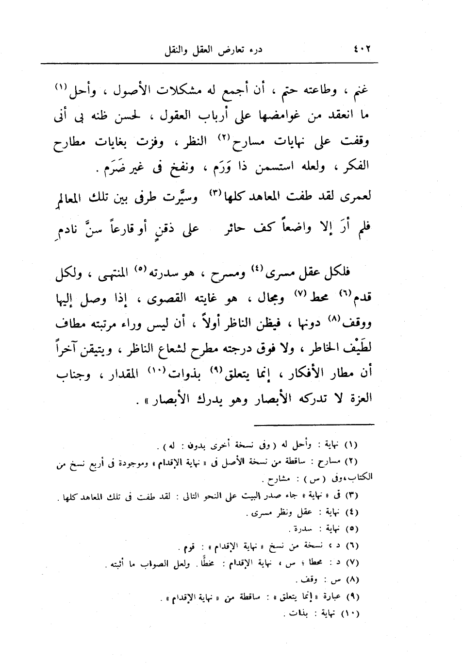 فلكل عقل مسرى ومسرح، هو سدرته المنتهى، ولكل قدم محط ومجال، هو غايته القصوى، إذا وصل إليها ووقف دونها، فيظن الناظر أولاً، أن ليس وراء مرتبته مطاف لطيف الخاطر، ولا فوق درجته مطرح لشعاع الناظر، ويتيقن آخراً أن مطار الأفكار، إنما يتعلق بذوات المقدار، وجناب العزة لا تدركه الأبصار وهو يدرك الأبصار) .