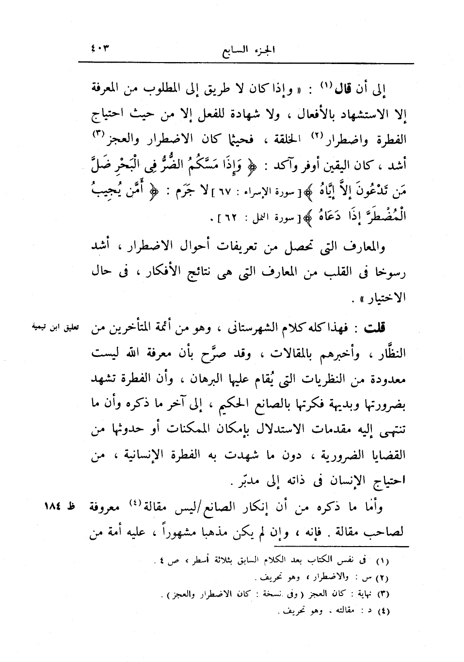 قلت: فهذا كله كلام الشهرستاني، وهو من أئمة المتأخرين من النظار، وأخبرهم بالمقالات، وقد صرح بأن معرفة الله ليست معدودة من النظريات التي يقام عليها البرهان، وأن الفطرة تشهد بضرورتها وبديهة فكرتها بالصانع الحكيم، إلى آخر ما ذكره وأن ما تنتهي إليه مقدمات الاستدلال بإمكان الممكنات أو حدوثها من القضايا الضرورية، دون ما شهدت به الفطرة الإنسانية، من احتياج الإنسان في ذاته إلى مدبر.
