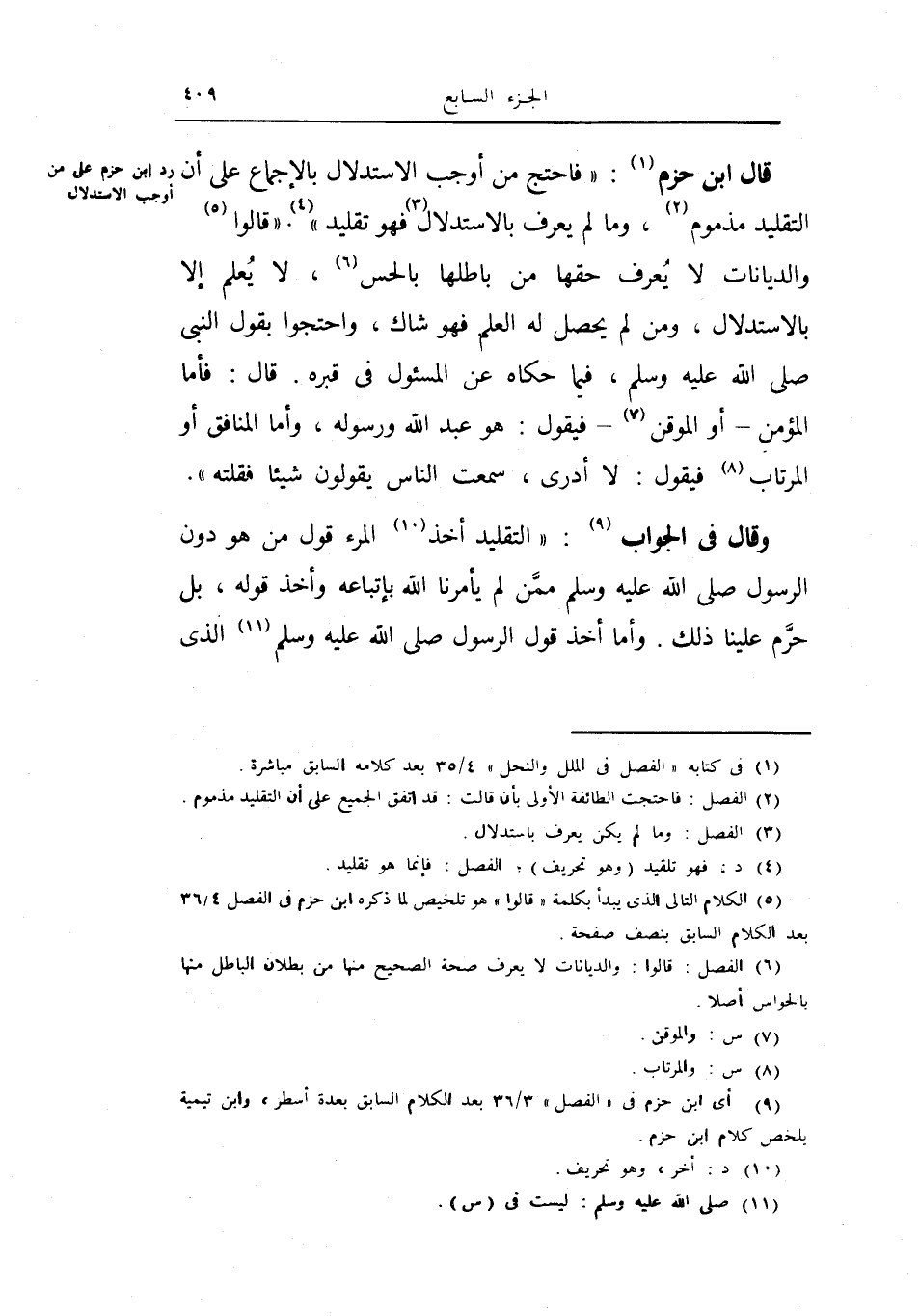 قال ابن حزم: (فاحتج من أوجب الاستدلال بالإجماع على أن التقليد مذموم، وما لم يعرف بالاستدلال فهو تقليد) .