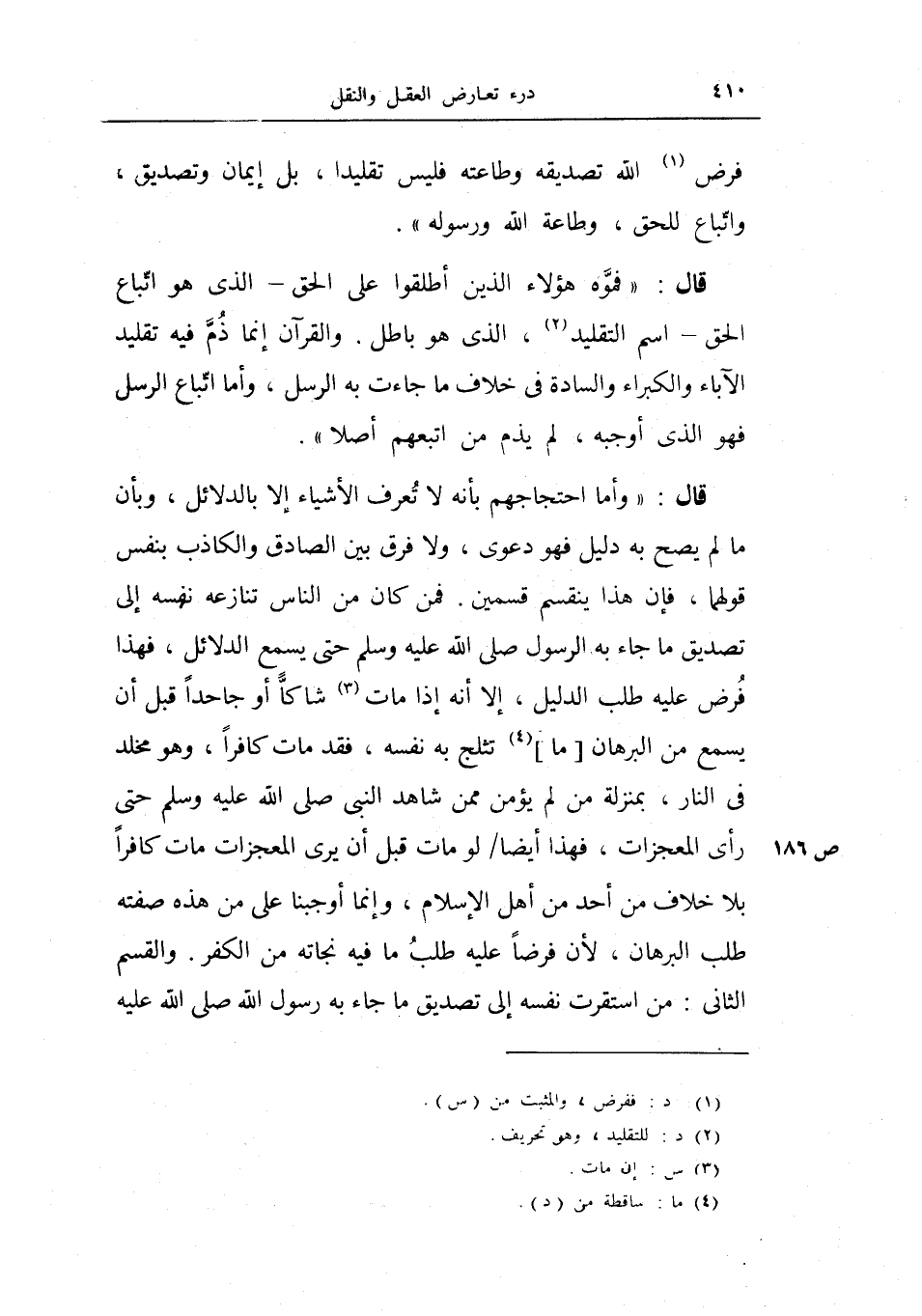 فمن كان من الناس تنازعه نفسه إلى تصديق ما جاء به الرسول صلى الله عليه وسلم حتى يسمع الدلائل، فهذا فرض عليه طلب الدليل، إلا أنه مات شاكاً أو جاحداً قبل أن يسمع من البرهان ما تثلج به نفسه، فقد مات كافراً، وهو مخلد في النار، بمنزلة من لم يؤمن ممن شاهد النبي صلى الله عليه وسلم حتى رأى المعجزات، فهذا أيضاً لو مات قبل أن يرى المعجزات مات كافراً بلا خلاف من أحد من أهل الإسلام، وإنما أوجبنا على من هذه صفته طلب البرهان، لأن فرضاً عليه طلب ما فيه نجاته من الكفر.