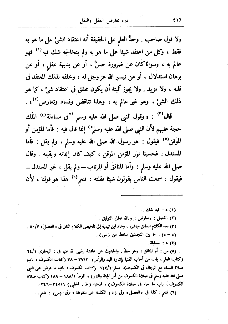 وحد العلم على الحقيقة أنه اعتقاد الشيء على ما هو به فقط، وكل من اعتقد شيئاً على ما هو به ولم يتخالجه شك فيه فهو عالم به، وسواء كان عن ضرورة حسً، أو عن بديهة عقل، أو عن برهان استدلال، أو عن تيسير الله عز وجل له، وخلقه لذلك المعتقد في قلبه، ولا مزيد ولا يجوز البتة أن يكون محقق في اعتقاد شيء، كما هو ذلك الشيء، وهو غير عالم به، وهذا تناقض وفساد وتعارض) .