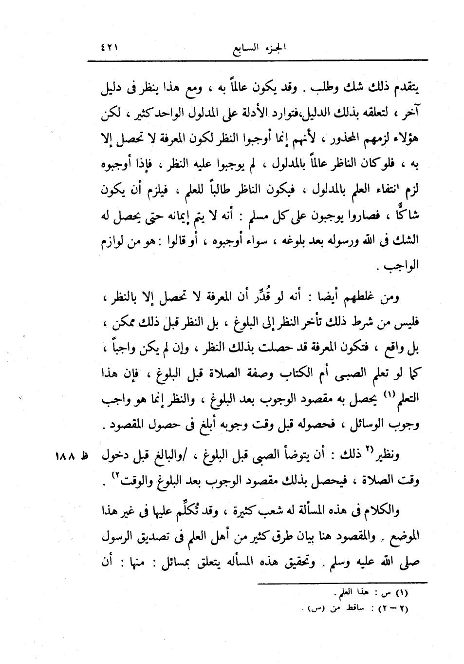 أنه لو قدر أن المعرفة لا تحصل إلا بالنظر، فليس من شرط ذلك تأخر النظر إلى البلوغ، بل النظر قبل ذلك ممكن، بل واقع، فتكون المعرفة قد حصلت بذلك النظر، وإن لم يكن واجباً كما لوتعلم الصبي أم الكتاب وصفة الصلاة قبل البلوغ، فإن هذا التعلم يحصل به مقصود الوجوب بعد البلوغ، والنظر إنما هو واجب وجوب الوسائل، فحصوله قبل وقت وجوبه أبلغ في حصول المقصود.