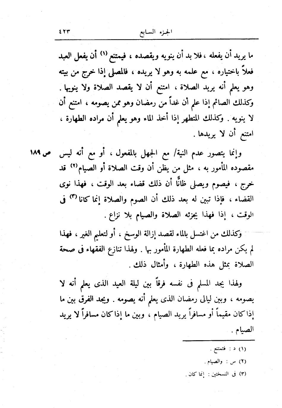 وإنما يتصور عدم النية مع الجهل بالمفعول، أو مع أنه ليس مقصوده المأمور به، مثل من يظن أن وقت الصلاة أو الصيام قد خرج، فيصوم ويصلي ظاناً أن ذلك قضاء بعد الوقت، فهذا نوى القضاء، فإذا تبين له بعد ذلك أن الصوم والصلاة إنما كانا في الوقت، إذا فهذا يجزئه الصلاة والصيام بلا نزاع.
