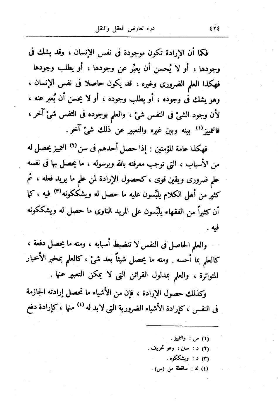 فكما أن الإرادة تكون موجودة في نفس الإنسان، وقد يشك في وجودها، أولا يحسن أن يعبر عن وجودها، أو يطلب وجودها فهكذا العلم الضروري وغيره، قد يكون حاصلاً في نفس الإنسان، وهو يشك في وجوده، أو يطلب وجوده، أو لا يحسن أن يعبر عنه، لأن وجود الشيء في النفس شيء، والعلم بوجوده في النفس شيء آخر، فالتمييز بينه وبين غيره والتعبير عن ذلك شيء آخر.