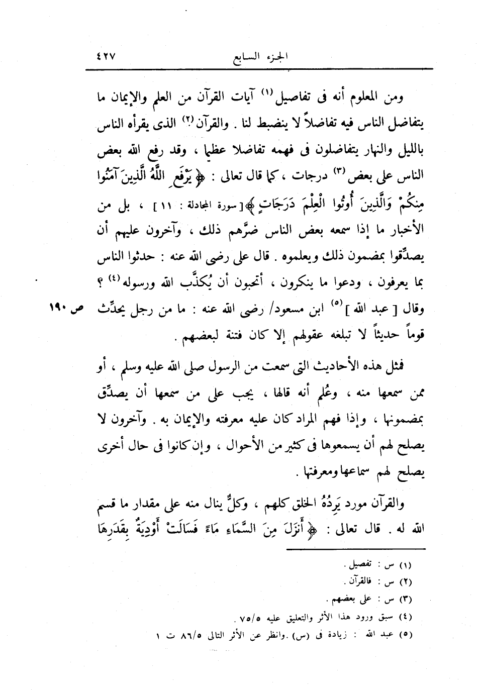 والقرآن الذي يقرأه الناس بالليل والنهار يفاضلون في فهمه تفاضلاً عظيماً، وقد رفع الله بعض الناس على بعض درجات، كما قال تعالى: {يرفع الله الذين آمنوا منكم والذين أوتوا العلم درجات} ، بل من الأخبار ما إذا سمعه بعض الناس ضرهم ذلك، وآخرون عليهم أن يصدقوا بمضمون ذلك ويعلموه، قال علي رضي الله عنه: حدثوا الناس بما يعرفون، ودعوا ما ينكرون، أتحبون أن يكذب الله ورسول؟ وقال عبد الله بن مسعود رضي الله عنه: ما من رجل يحدث قوماً حديثاً لا تبلغه عقولهم إلا كان فتنة لبعضهم.