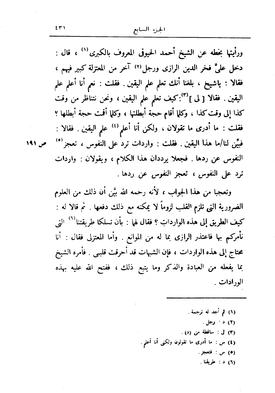 ورأيتها بخطه عن الشيخ أحمد الحيوقي المعروف بالكبرى، قال: دخل علي فخر الدين الرازي ورجل آخر من المعتزلة كبير فيهم، فقالا: يا شيخ، بلغنا أنك تعلم علم اليقين.