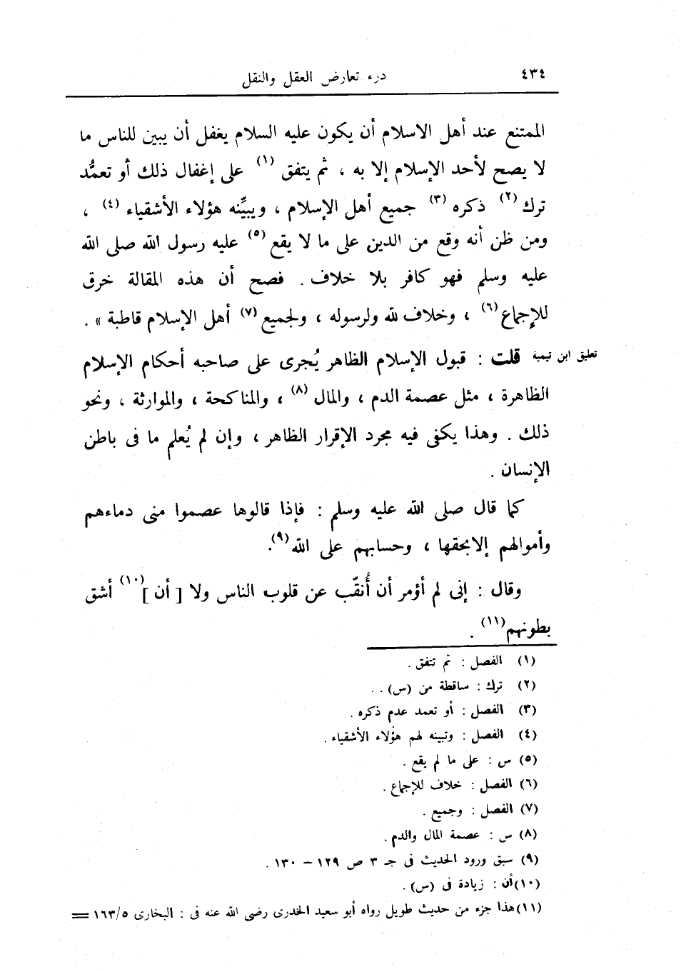 الممتنع عند أهل الإسلام أن يكون عليه السلام يغفل أن يبين للناس ما لا يصح لأحد الإسلام إلا به، ثم يتفق على إغفال ذلك أو تعمد ترك ذكره جميع أهل الإسلام، ويبينه هؤلاء الأشقياء، ومن ظن أنه وقع من الدين على ما لا يقع عليه رسول الله صلى الله عليه وسلم فهو كافر بلا خلاف.