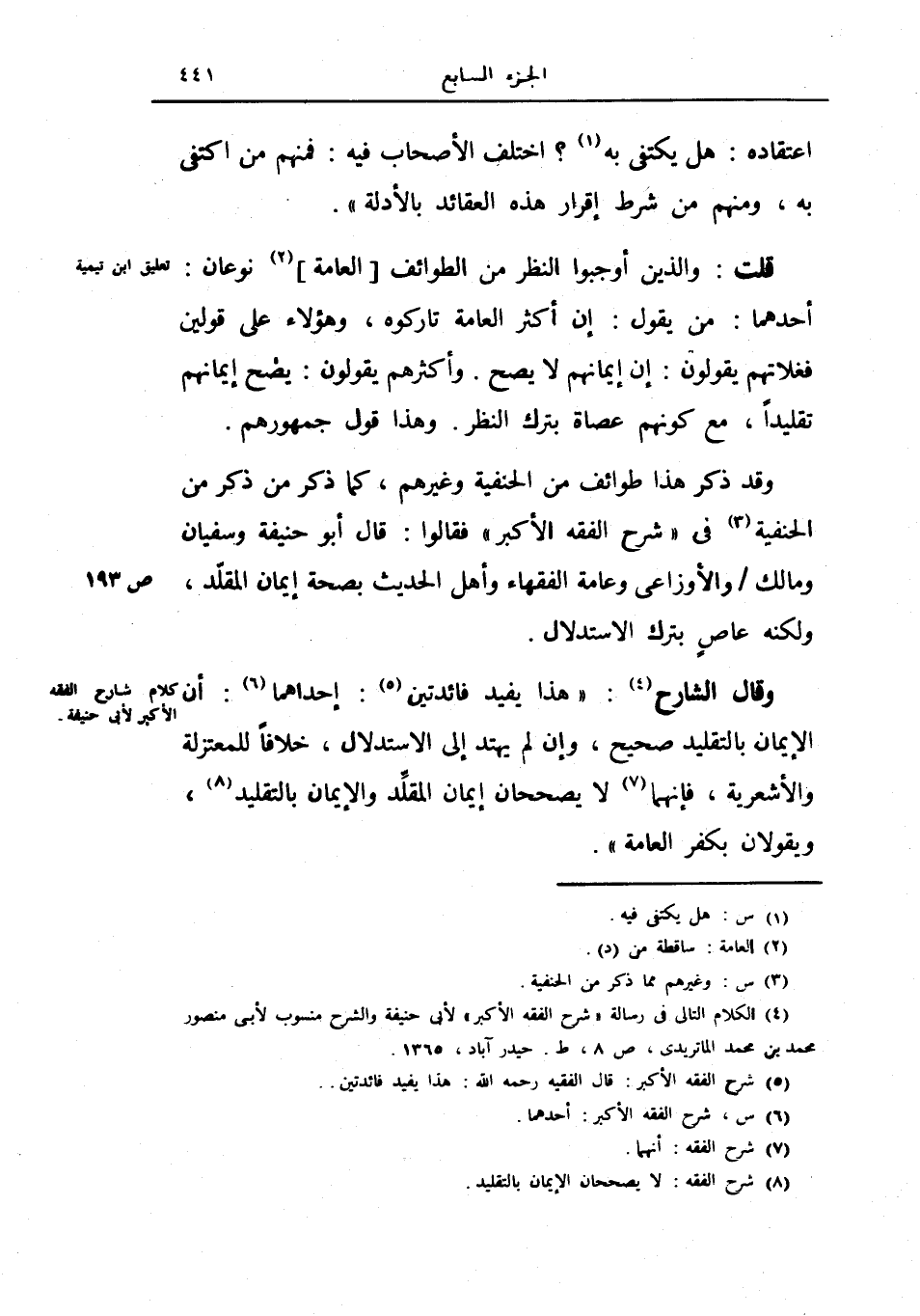 قد ذكر هذا طوائف من الحنفية وغيرهم، كما ذكر من ذكر من الحنفية في شرح الفقه الأكبر فقالوا: قال أبو حنيفة وسفيان ومالك والأوزاعي وعامة الفقهاء وأهل الحديث بصحة إيمان المقلد، ولكنه عاص بترك الاستدلال.