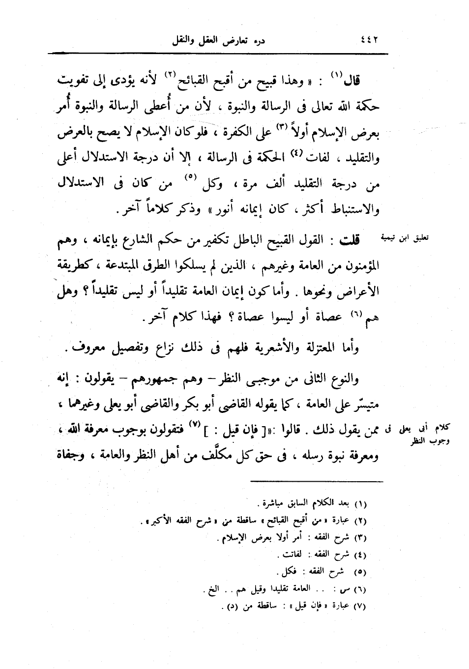 وقال: (وهذا قبيح من أقبح القبائح لأنه يؤدي إلى تفويت حكمة الله تعالى في الرسالة والنبوة، لأن من أعطي الرسالة والنبوة أمر بعرض الإسلام أولاً على الكفرة، فلو كان الإسلام لا يصح بالعرض والتقليد، لفات الحكمة في الرسالة، إلا أن درجة الاستدلال أعلى من درجة التقليد ألف مرة، وكل من كان في الاستدلال والاستنباط أكثر، كان إيمانه أنور) .