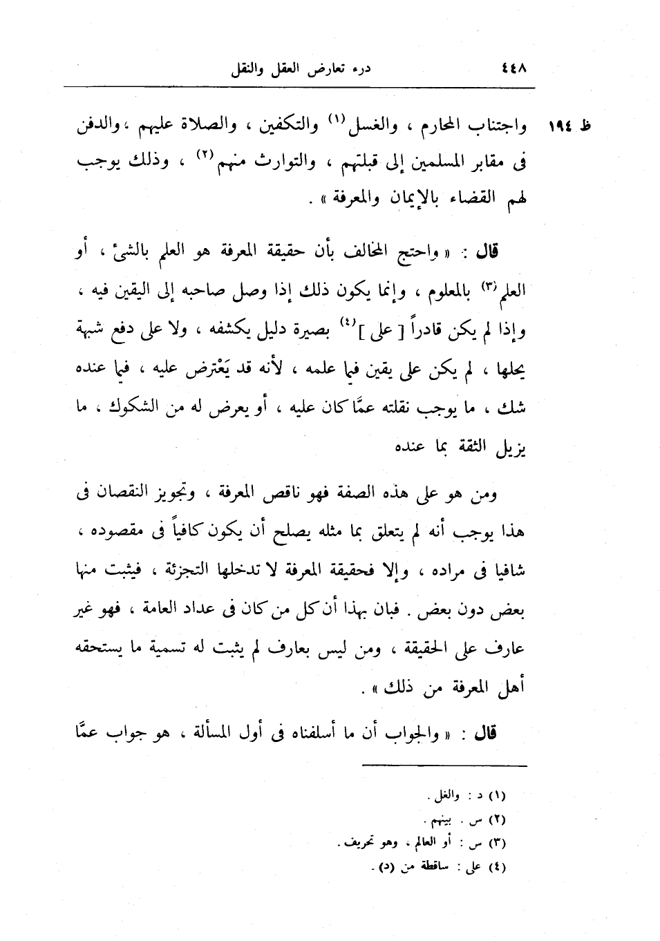 قال: (واحتج المخالف بأن حقيقة المعرفة هو العلم بالشيء، أو العلم بالمعلوم، وإنما يكون ذلك إذا وصل صاحبه إلى اليقين فيه، وإذا لم يكن قادراً على بصيرة دليل يكشفه، ولا على دفع شبهة يحلها، لم يكن على يقين فيما علمه، لأنه قد يعترض عليه، فيما عنده شك، ما يوجب نقلته عما كان عليه، أو يعرض له من الشكوك، ما يزيل الثقة بما عنده.