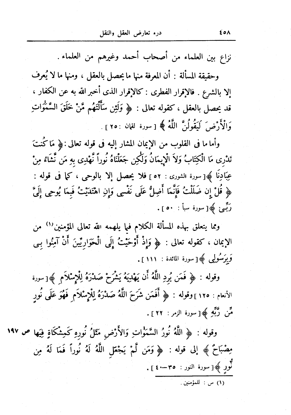 وأما ما في القلوب من الإيمان المشار إليه في قوله تعالى: {ما كنت تدري ما الكتاب ولا الإيمان ولكن جعلناه نورا نهدي به من نشاء من عبادنا} فلا يحصل إلا بالوحي، كما في قوله: {قل إن ضللت فإنما أضل على نفسي وإن اهتديت فبما يوحي إلي ربي} .