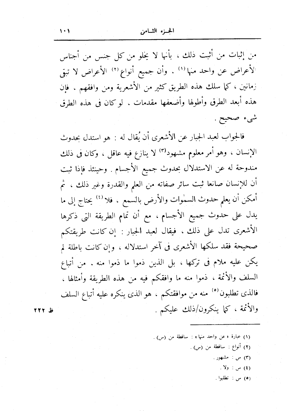 فالجواب لعبد الجبار عن الأشعري أن يقال له: هو استدل بحدوث الإنسان، وهو أمر معلوم مشهود لا ينازع فيه عاقل، وكان في ذلك مندوحة له عن الاستدلال بحدوث جميع الأجسام، وحينئذ فإذا ثبت أن للإنسان صانعاً ثبت سائر صفاته من العلم والقدرة وغير ذلك، ثم أمكن أن يعلم حدوث السماوات والأرض بالسمع، فلا يحتاج إلى ما يدل على حدوث جميع الأجسام، مع أن تمام الطريقة التي ذكرها الأشعري تدل على ذلك، فيقال لعبد الجبار: إن كانت طريقتكم صحيحة فقد سلكها الأشعري في آخر استدلاله، وإن كانت باطلة لم يكن عليه ملام في تركها، بل الذين ذموا ما ذموا منه، من أتباع السلف والأئمة، ذموا منها ما وافقكم فيه من هذه الطريقة وأمثالها، فالذي تطلبون منه من موافقتكم، هو الذي ينكره عليه السلف والأئمة، كما ينكرون ذلك عليكم.