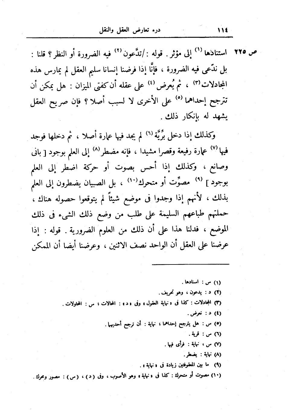 قوله: تدعون فيه الضرورة أو النظر؟ قلنا: بل ندعي فيه الضرورة، فإنا أذا فرضنا إنساناً سليم العقل لم يمارس هذه المجادلات، ثم يعرض على عقله أن كفتي الميزان: هل يمكن أن تترجح إحداهما على الأخرى لا لسبب أصلاً؟ فإن صريح العقل يشهد له بإنكار ذلك.