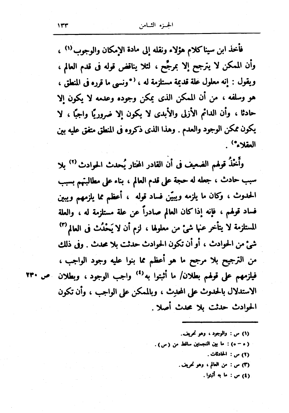 فأخذ ابن سينا كلام هؤلاء ونقله إلى ماده الإمكان والوجوب، وأن الممكن لا يترجح إلا بمرجح، لئلا يناقض قوله في قدم العالم، ويقول: إنه معلول علة قديمة مستلزمة له ونسى ما قرره في المنطق، هو وسلفه، من أن الممكن الذي يمكن وجوده وعدمه لا يكون إلا حادثاً، وأن الدائم الأزلى والأبدي لا يكون إلا ضرورياً واجباً، لا يكون ممكن الوجود والعدم، وهذا الذي ذكروه في المنطق متفق عليه بين العقلاء.