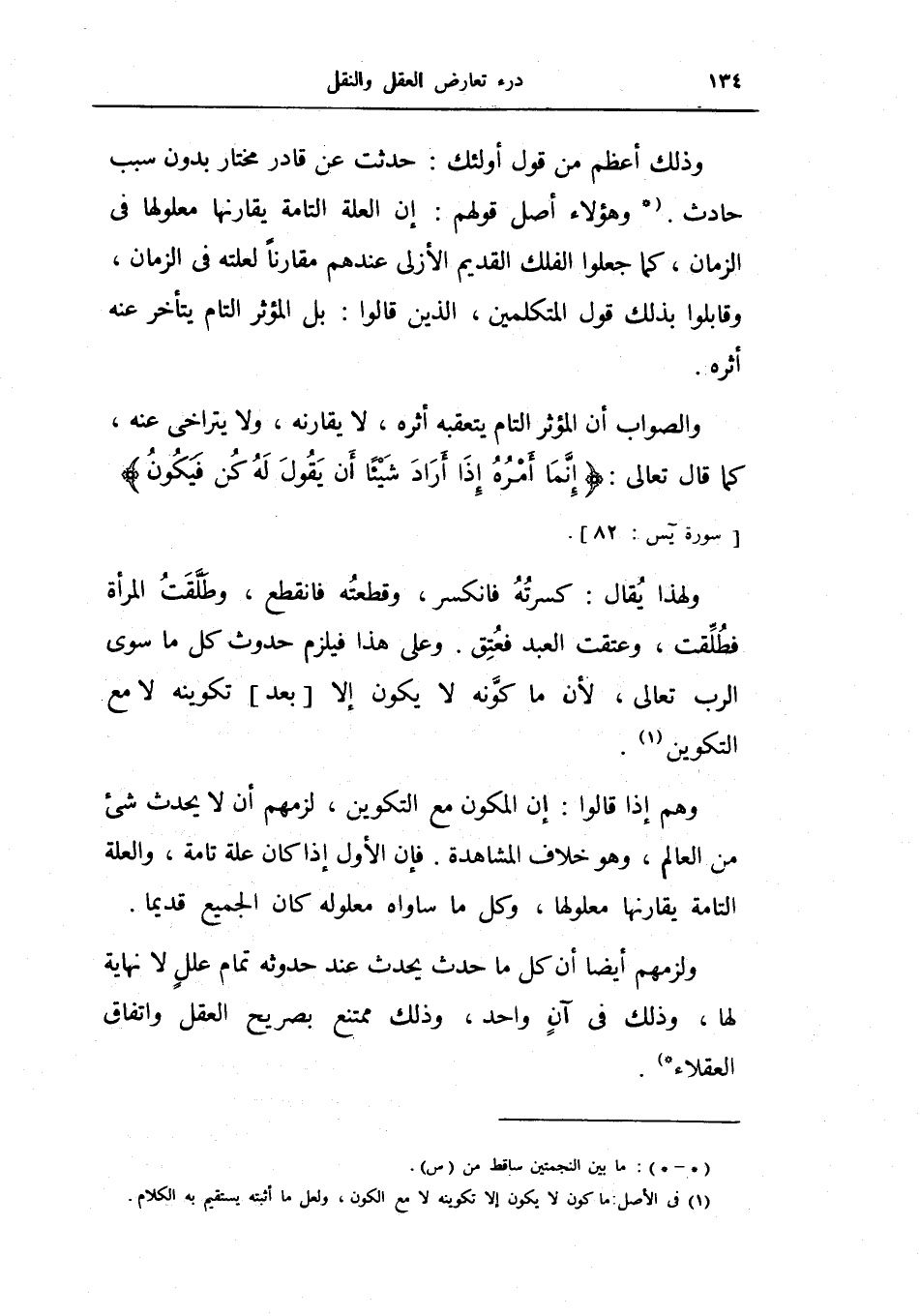 ولزمهم أيضاً أن كل ما حدث يحدث عند حدوثه تمام علل لا نهاية لها، وذلك في آن واحد، وذلك ممتنع بصريح العقل واتفاق العقلاء.
