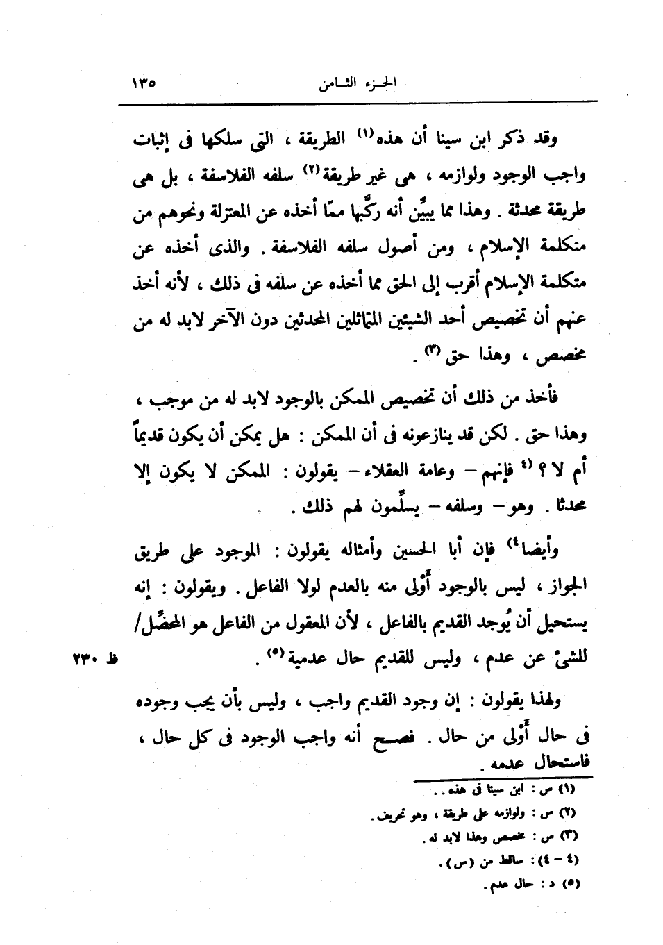 وهذا مما يبين أنه ركبها مما أخذه عن المعتزلة ونحوهم من متكلمة الإسلام، ومن أصول سلفه الفلاسفة، والذي أخذه عن متكلمة الإسلام أقرب إلى الحق مما أخذه عن سلفه في ذلك، لأنه أخذ عنهم أن تخصيص أحد الشيئين المتماثلين المحدثين دون الآخر لا بد له من مخصص، وهذا حق.