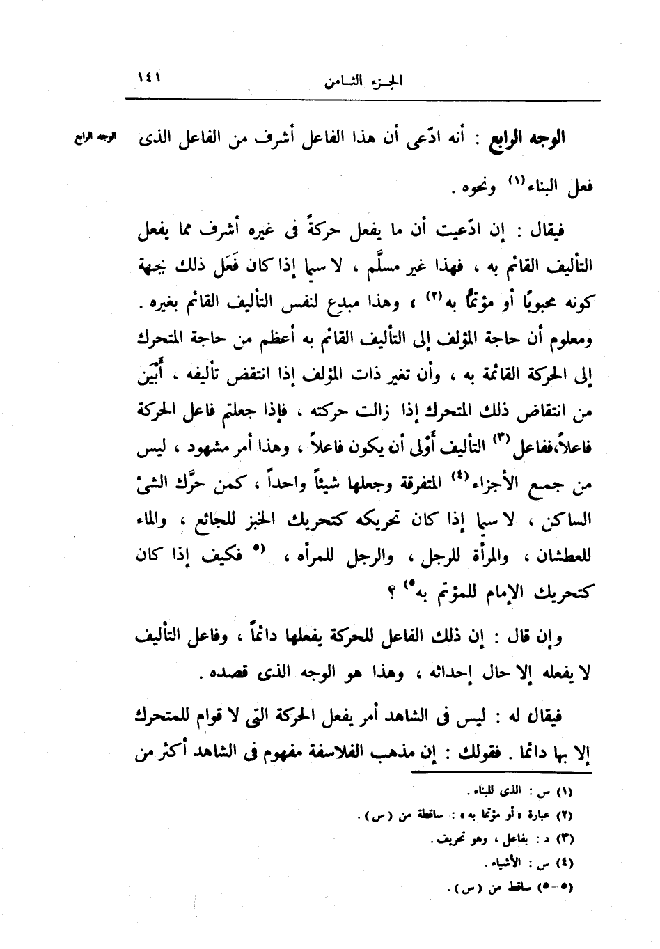 ومعلوم أن حاجة المؤلف إلى التأليف قائم به أعظم من حاجة المتحرك إلى الحركة القائمة به، وأن تغير ذات المؤلف إذا انتفض تأليفه، أبين من انتقاض ذلك المتحرك إذا والت حركته، فإذا جعلتم فاعل الحركة فاعلاً، ففاعل التأليف أولى أن يكون فاعلاً، وهذا أمر مشهود، ليس من جمع الأجزاء المتفرقة وجعلها شيئاً واحداً، كمن حرك الشيء الساكن، لاسيما إذا كان تحريكه كتحريك الخبز للجائع، والماء للعطشان، والمرأة للرجل، والرجل للمرأة، فكيف إذا كان كتحريك الإمام للمؤتم به؟