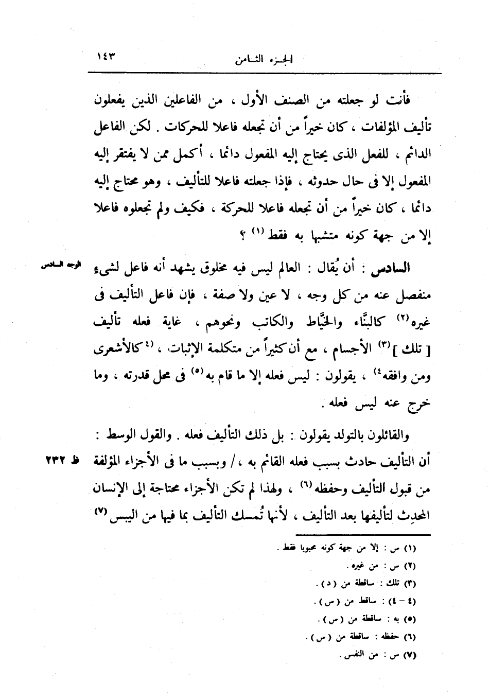 لكن الفاعل الدائم، للفعل الذي يحتاج إليه المفعول دائماً، أكمل ممن لا يفتقر إليه المفعول إلا في حال حدوثه، فإذا جعلته فاعلاً للتأليف، وهو محتاج إليه دائماً، كان خيراً من أن تجعله فاعلاً للحركة، فكيف ولم تجعلوه فاعلاً إلا من جهة كونه متشبهاً به فقط؟.