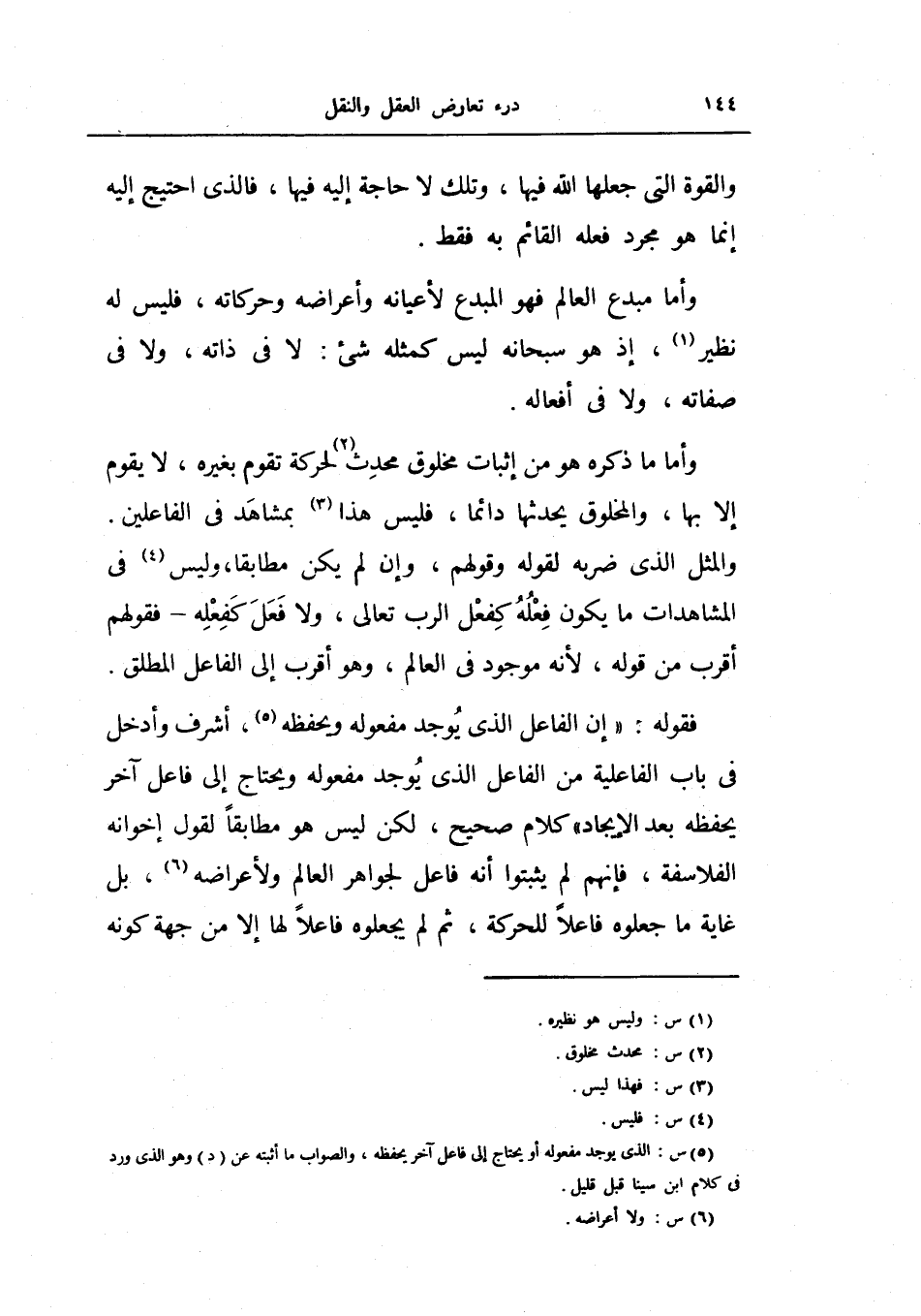 وأما ما ذكره هو من إثبات مخلوق محدث لحركة تقوم بغيره، لا يقوم إلا بها، والمخلوق يحدثها دائماً، فليس هذا بمشاهد في الفاعلين، والمثل الذي ضربه لقوله وقولهم، وإن لم يكن مطابقاً، ولس في المشاهدات ما يكون فعله كفعل الرب تعالى، ولا فعل كفعله - فقولهم أقرب من قوله، لأنه موجود في العالم، وهو أقرب إلى الفاعل المطلق.