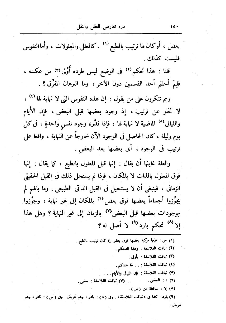 وبم تنكرون على من يقول: إن هذه النفوس التي لا نهاية لها، لا تخلو عن ترتيب، إذ وجود بعضها قبل البعض، فإن الأيام والليالي الماضية لا نهاية لها، فإذا قدرنا وجود نفس واحدة، في كل يوم وليلة، كان الحاصل في الوجود الآن خارجاً عن النهاية، واقعاً على ترتيب في الوجود، أي بعضها بعد البعض.