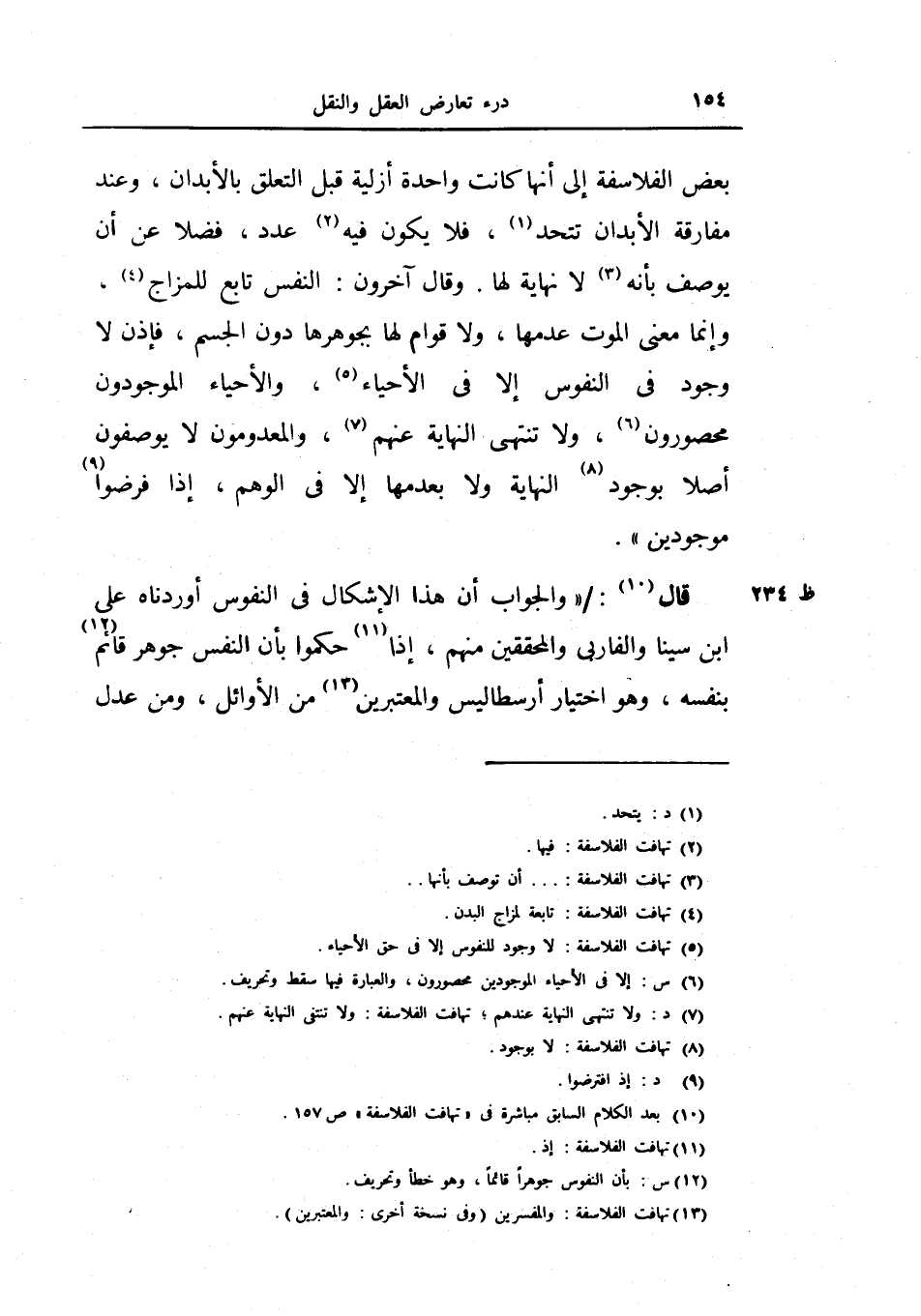 قال: (والجواب أن هذا الإشكال في النفوس أوردناه على ابن سينا والفارابي والمحققين منهم، إذا حكموا بأن النفس جوهر قائم بنفسه، وهو اختيار أرسطاليس والمعتبرين من الأوائل، ومن عدل